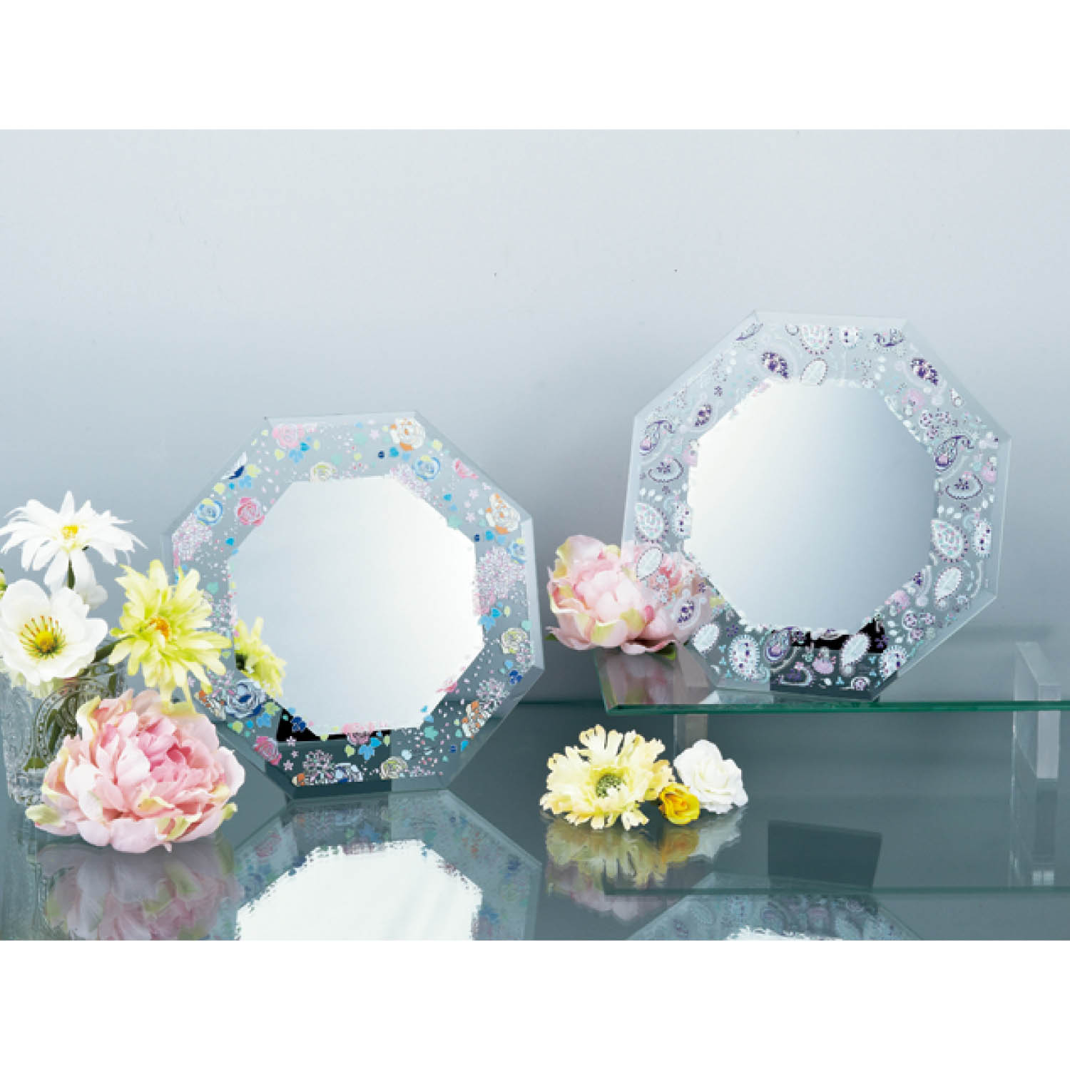 ロンドンでフリーランスのテキスタイルデザイナーとして活躍する、なかのまりの氏がデザインした八角ミラー風水的に縁起が良いとされている八角ミラーに、透明感のあるモチーフをデザインしました「パープルペイズリー」、「ゴージャスフラワーズ」の2柄をご用意壁掛け・卓上両用タイプなので、玄関やリビングなどお好きな場所でお使いいただけます。#卓上ミラー会#卓上鏡#壁掛けミラー#壁掛け鏡#八角ミラー)