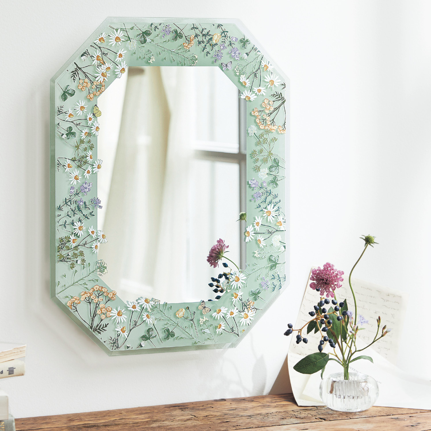 ガラスに水彩風のローズや野草がえがかれたミラーセットのヒモで壁に掛けて使えます。#壁掛けミラー#壁掛け鏡#八角ミラー)